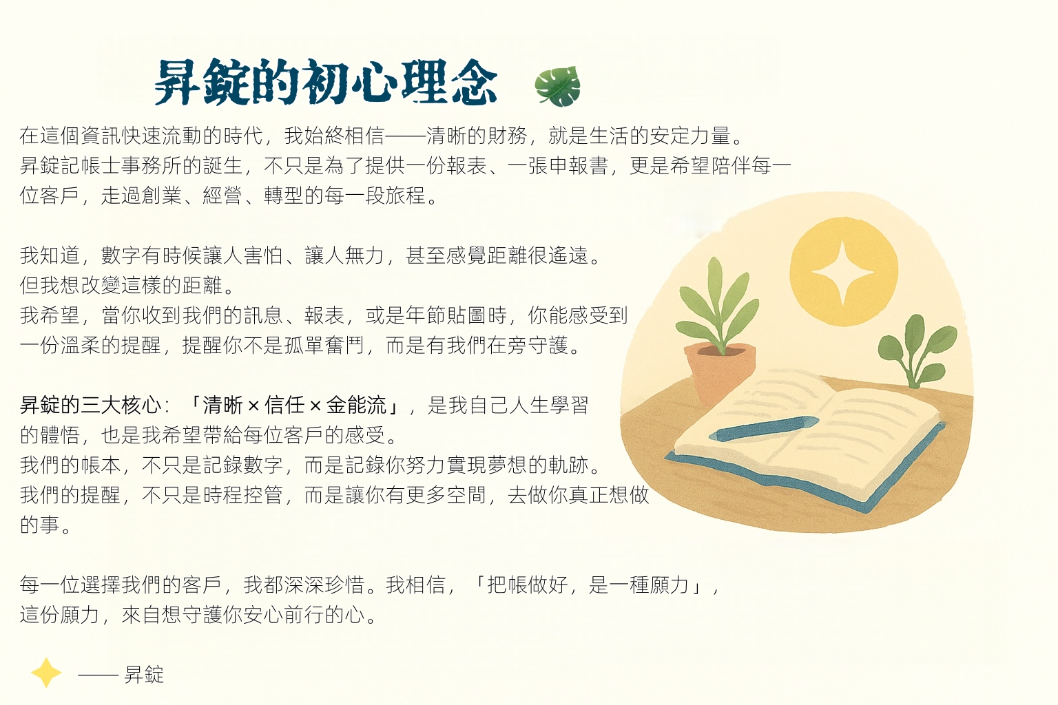 昇錠記帳士事務所的誕生,不只是為了提供一份報表、一張申報書,更是希望陪伴每一位客戶,走過創業、經營、轉型的每一段旅程。
